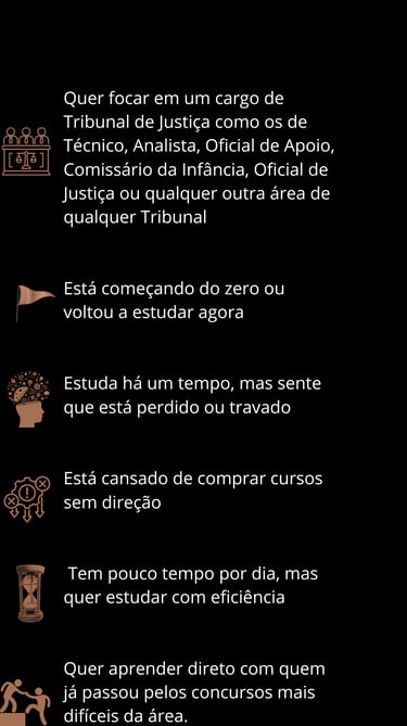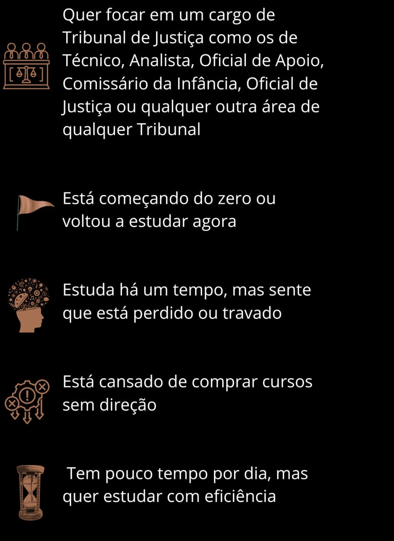 Você terá acesso a um completo curso que detalhará os pilares que foram essenciais para que eu "furasse a fila" dos concursos e alcançasse a aprovação em 1º lugar no TJMG 2022 e em 4º lugar no TJSP 2023, apesar de ter conciliado os estudos com o trabalho e a maternidade.
